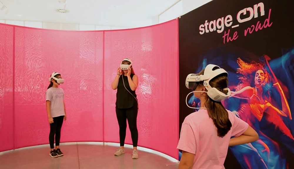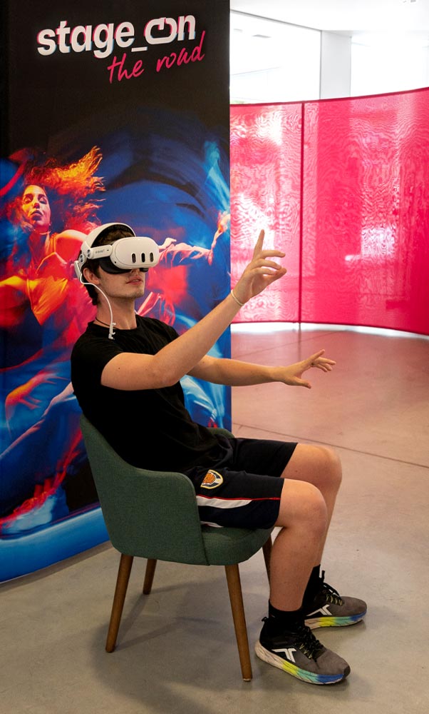 Nuestro espacio itinerante dispone de pantalla y de las últimas gafas MetaQuest RV, permitiendo a los usuarios acceder a nuestra plataforma y disfrutar de una variedad de experiencias inmersivas de Danza VR. Entre los contenidos que ofrecemos se incluyen videodanzas en 360º, 180º y 3D, así como contenido audiovisual interactivo que enriquecerá la percepción de la danza y de las Artes vivas en entornos digitales.